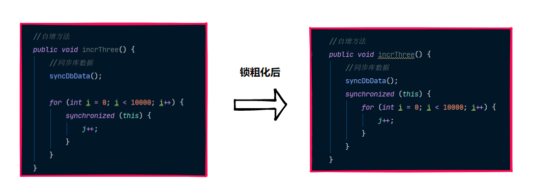 J V M会检测到一连串的操作都对同一个对象加锁(for循环10000次执行j++,没有锁粗化就要进行10000次加锁/解锁),此时J V M就会将加锁的范围粗化到这一连串操作的外部(比如for循环体外),使得这一连串操作只需要加一次锁即可。
