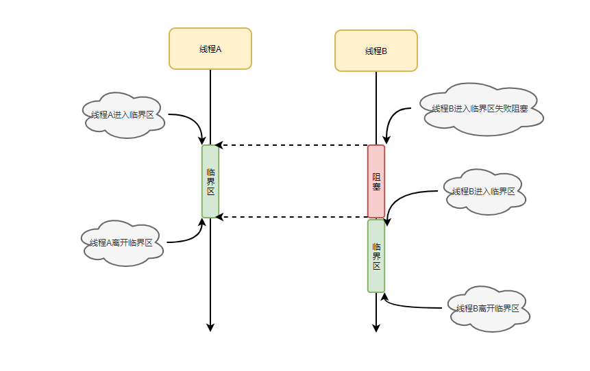 共享资源代码段又称为临界区(critical section),保证临界区互斥,是指执行临界区(critical section)的只能有一个线程执行,其他线程阻塞等待,达到排队效果。