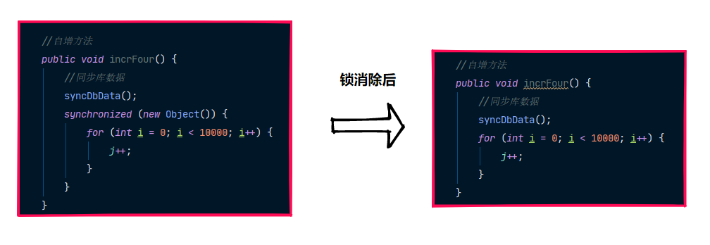 代码中使用Object作为锁,但是Object对象的生命周期只在incrFour()函数中,并不会被其他线程所访问到,所以在J I T编译阶段就会被优化掉(此处的Object属于没有逃逸的对象)。