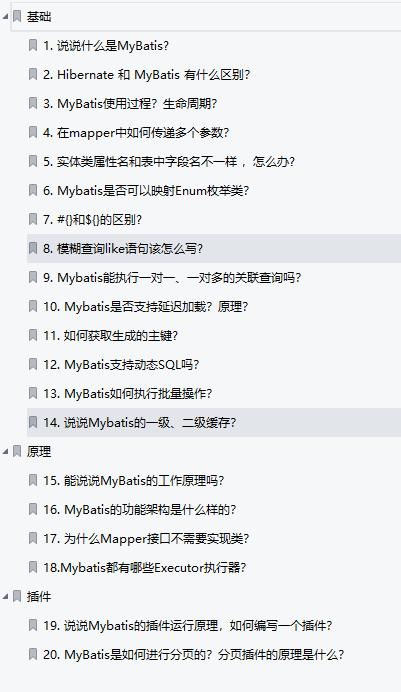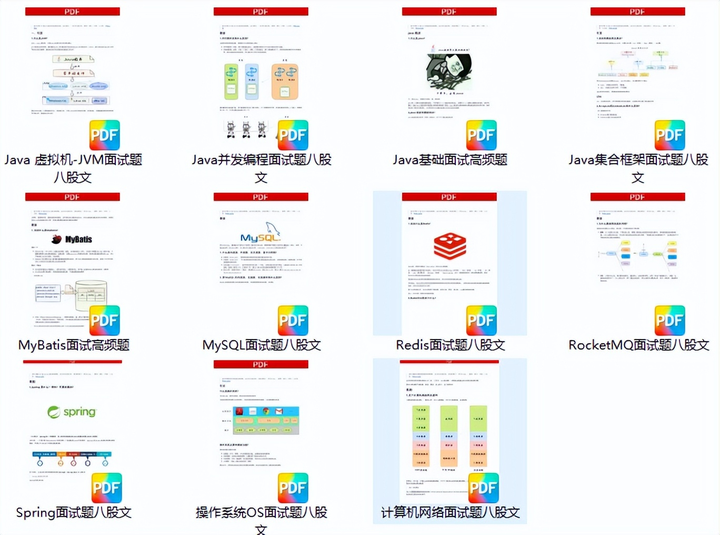 八股文一共有11份,分别是Java基础,Java集合,JVM,Java并发,mysql,mybatis,Redis,MQ,Spring,OS,计算机网络,由于篇幅限制就只展示部分,需要的小伙伴点击文末小卡片即可~