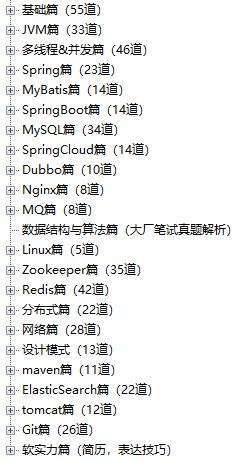 主要涵盖基础篇JVM,多线程,Spring,MyBatis,SpringBoot,MySQL,SpringCloud,Dubbo,MQ,数据结构与算法,设计模式等20多个主流技术栈。内容比较多,为了不影响大家的阅读体验,下面就展示下主要内容,需要的小伙伴 点击文末小卡片 即可~
