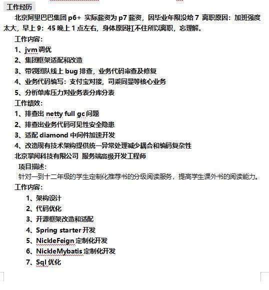 文章到这里篇幅已经很长了,就不继续拉长篇幅影响大家阅读体验了,需要上文展示的阿里Java面试速成指南+Java简历模板+阿里七面面经的小伙伴点击文末小卡片即可~