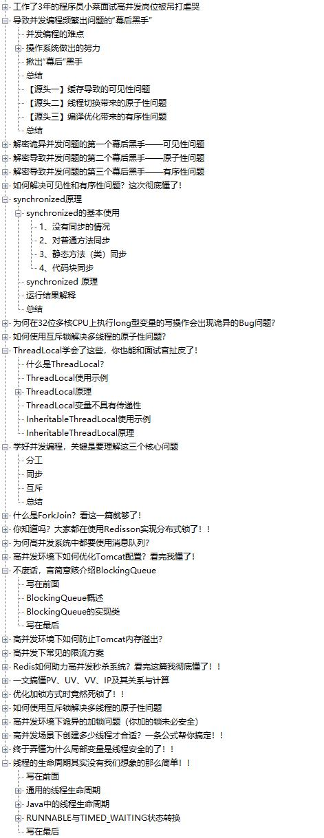 很多小伙伴也是一直在后台问,高并发编程到底该怎么学?究竟多高的并发才算高并发呢?对此LZ要说的是:并发编程需要我们静下心来,认真研读每一个知识点,将每个知识点研究透彻,由点到线,再由线连成面,形成自己的知识体系。深入掌握并发编程的技能之后,这样才能在面试中吊打所有敢于提问并发问题的面试官,工作中才能轻松解决高并发带来的一系列问题。(很抽象对不对?咱们下面来说一点具体的,如果你还是不知道该怎么学习高并发,你就按着阿里这份高并发速成笔记学)