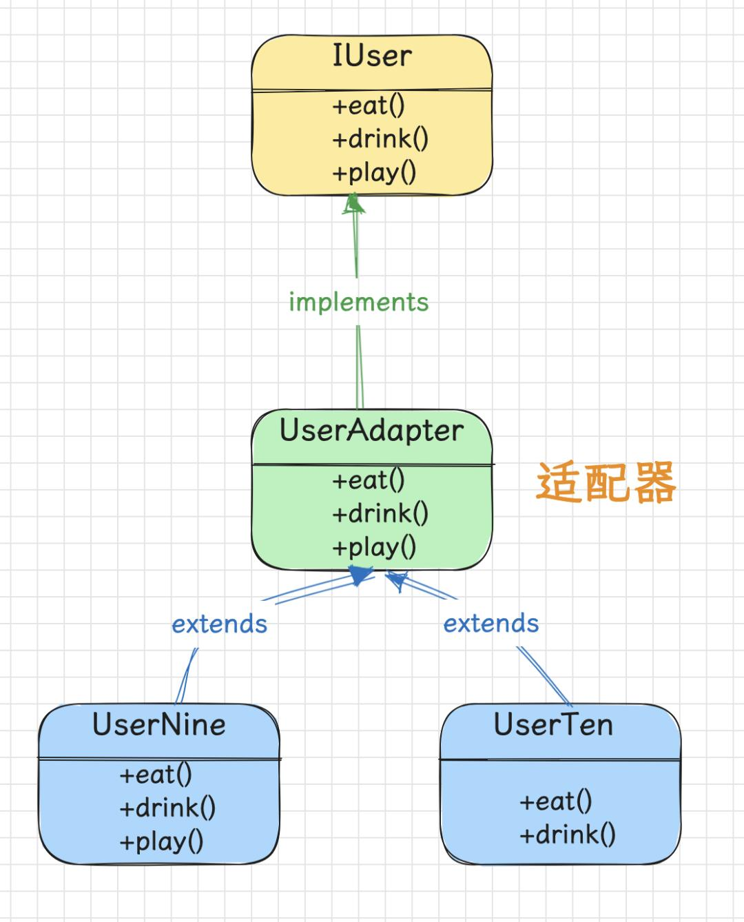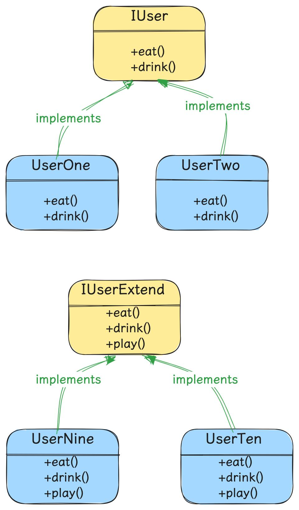 这样一来,把需要实现 play 方法的单独在弄一个接口出来。就像下面这样 IUser是之前的接口。IUserExtend接口是新加的,加入了 play() 方法,需要实现 play() 方法的实现类改成实现新的IUserExtend接口,只改几个实现关系,改动不是很大嘛,心满意足了。