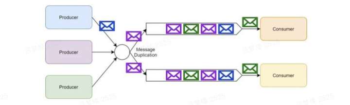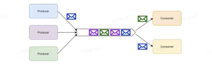 一个具体的消息只能由一个消费者消费,多个生产者可以向同一个消息队列发送消息,但是一个消息在被一个消息者处理的时候,这个消息在队列上会被锁住或者被移除并且其他消费者无法处理该消息。