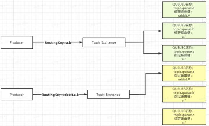 Topic Exchange:直接翻译的话叫做主题交换机,如果从用法上面翻译可能叫通配符交换机会更加贴切。这种交换机是使用通配符去匹配,路由到对应的队列。通配符有两种:"*" 、 "#"。需要注意的是通配符前面必须要加上"."符号。