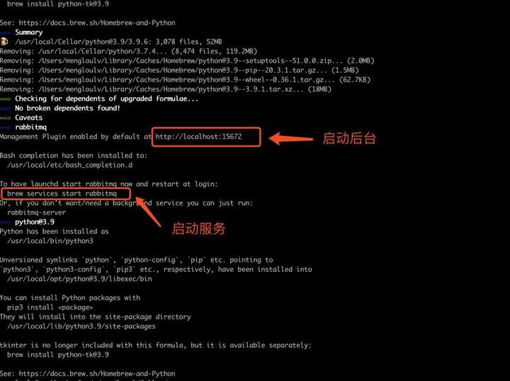 # 启动方式1:后台启动 brew services start rabbitmq # 启动方式2:当前窗口启动 cd /usr/local/Cellar/rabbitmq/3.8.19 rabbitmq-server