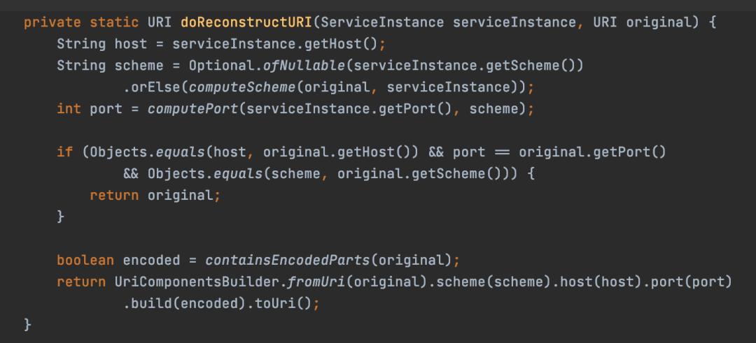 OpenFeign拿到了服务实例,此时就获取到了服务所在的ip和端口,接下来就会重新构建请求路径,将路径中的服务名替换成ip和端口,代码如下