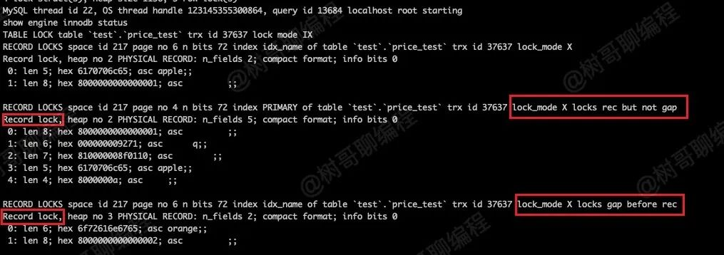 可以看到,其不仅有一个记录锁,还有一个间隙锁。这里可以猜测记录锁是 apple 索引的记录锁,而间隙锁则是 (负无穷,orange) 的间隙锁。