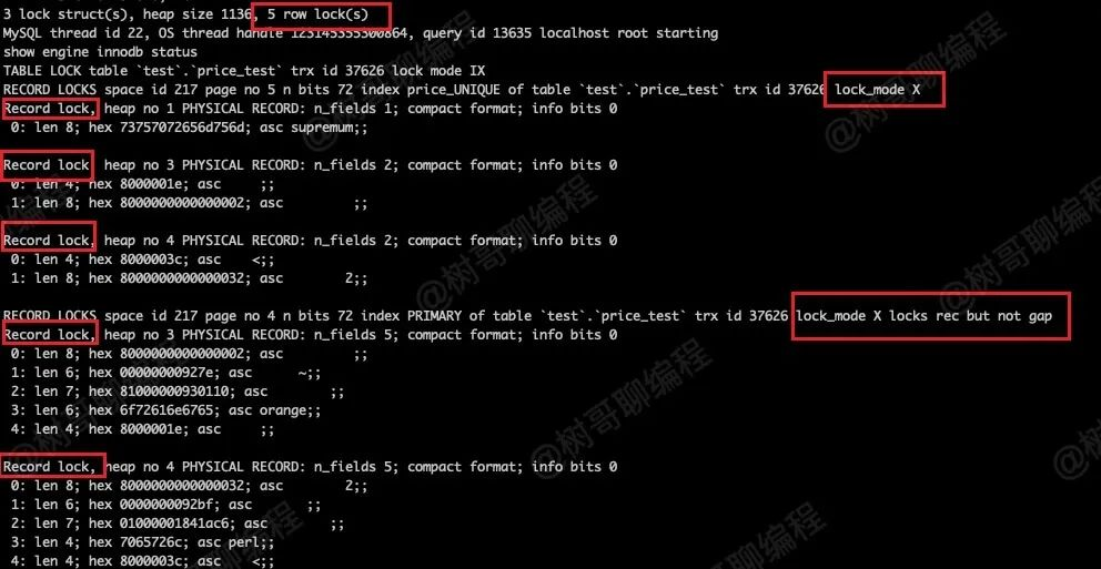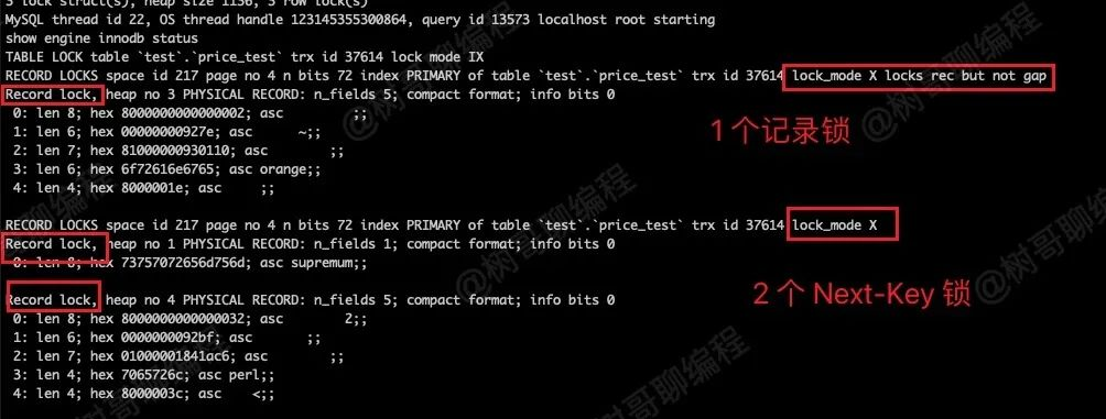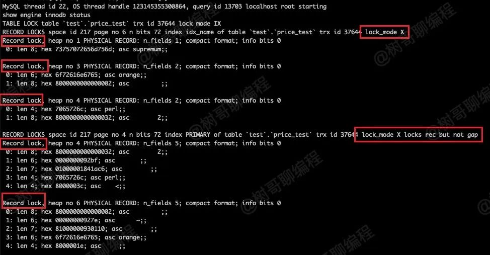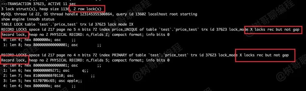 可以看到,其加的行级锁是 2 个记录锁,应该是 price = 10 这条索引记录的锁。