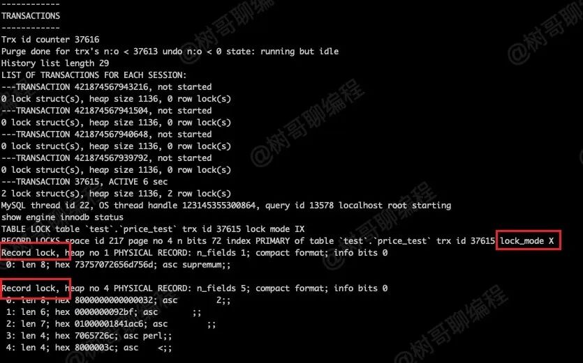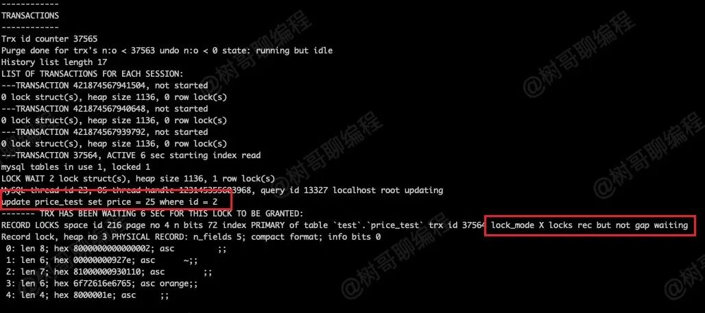 执行 show engine innodb status\G; 查看锁信息如下图所示。