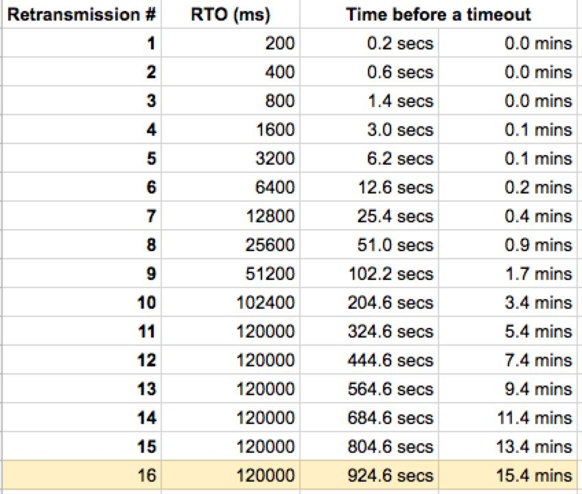 - 如果 RTT 比较小,那么 RTO 初始值就约等于下限 200ms,也就是第一轮的超时时间是 200 毫秒,由于 timeout 总时长是 924600 ms,表现出来的现象刚好就是重传了 15 次,超过了 timeout 值,从而断开 TCP 连接
