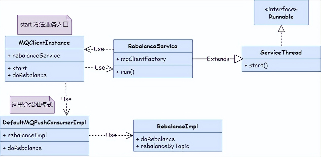 RocketMQ 客户端启动的时候,会启动重平衡线程 RebalanceService,在这里创建拉取消息的请求。下面 UML 类图展示了客户端启动重平衡线程的调用关系:
