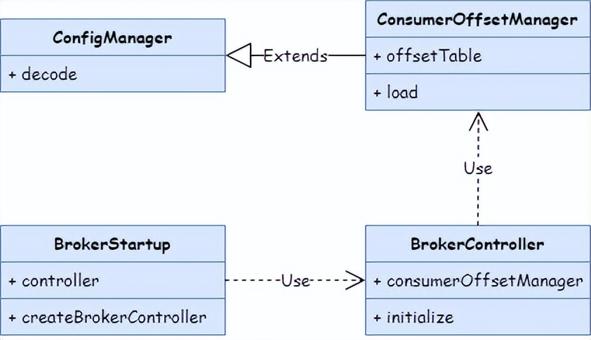 在 Broker 初始化时,会加载本地的偏移量文件,调用关系的 UML 类图如下: