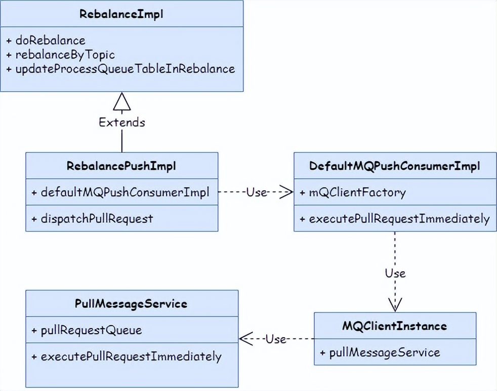 可以看到,无论是集群模式还是广播模式,updateProcessQueueTableInRebalance 方法最终都被调用了。这个方法封装了拉取消息的请求 PullRequest。这些请求被 put 到 PullMessageService 的 pullRequestQueue,然后 PullMessageService 使用死循环不停地从 pullRequestQueue 中 take 请求 发送到 Broker。这个处理的 UML 类图如下:
