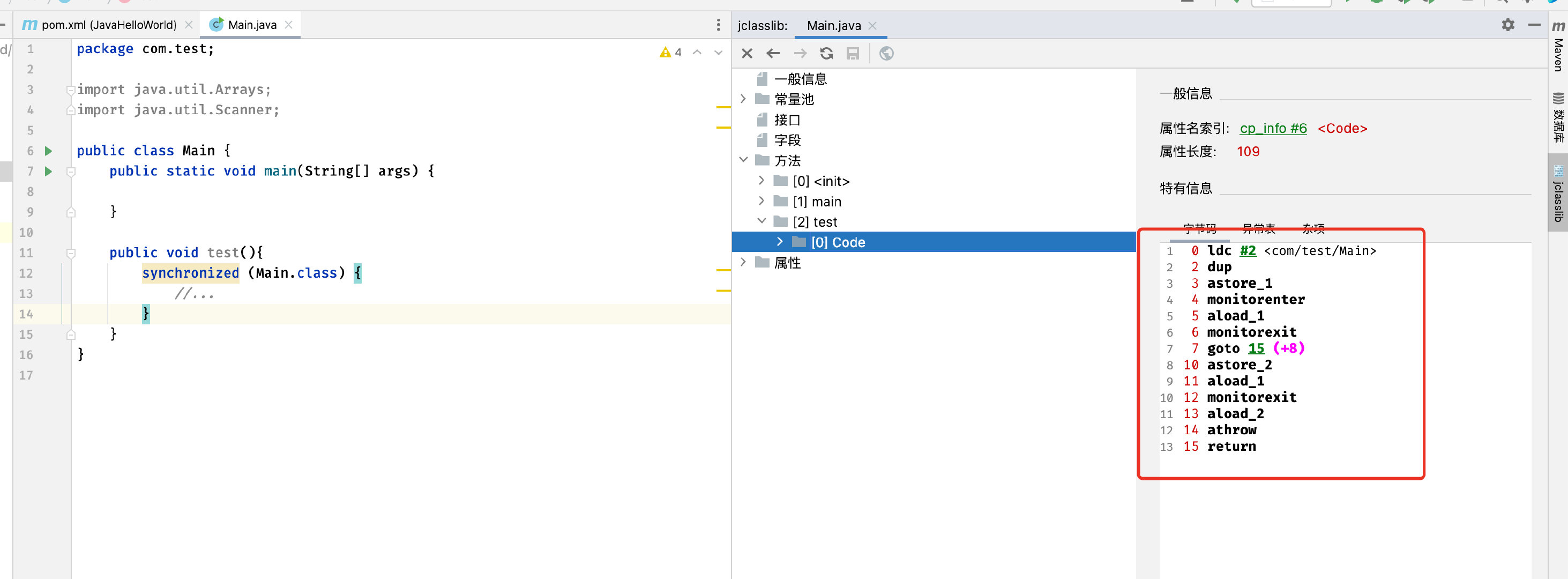 而第二个,其实是用来处理异常的,可以看到,它的位置是在12行,如果程序运行发生异常,那么就会执行第二个monitorexit,并且会继续向下通过athrow指令抛出异常,而不是直接跳转到15行正常运行下去。