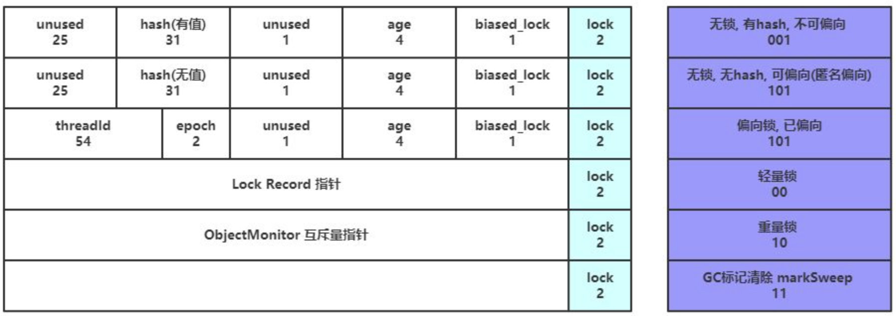 而对象头信息中,则包含了Mark Word用于存放hashCode和对象的锁信息,在不同状态下,它存储的数据结构有一些不同。