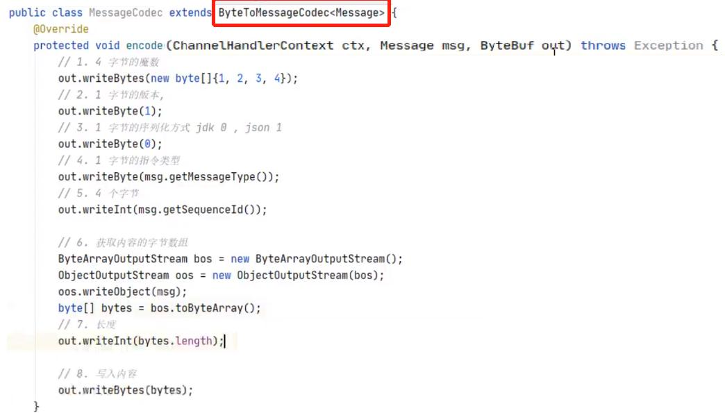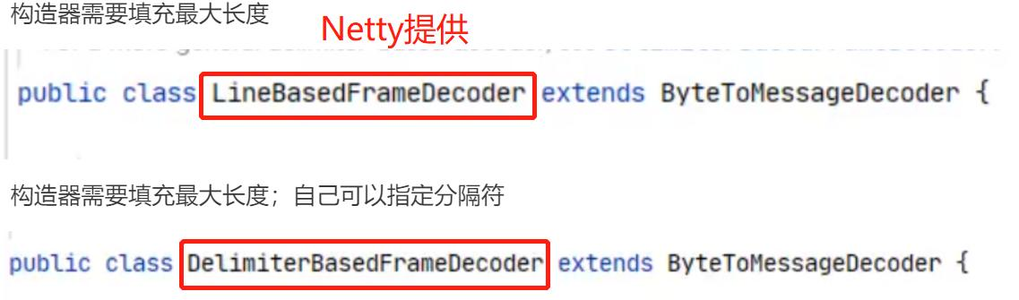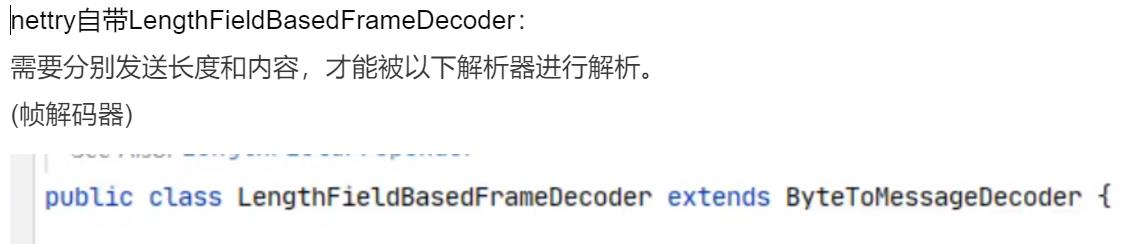 - 消息长度+消息:将消息分为消息头和消息体,消息头中包含表示消息总长度(或者消息体长度)的字段。Netty自带:
