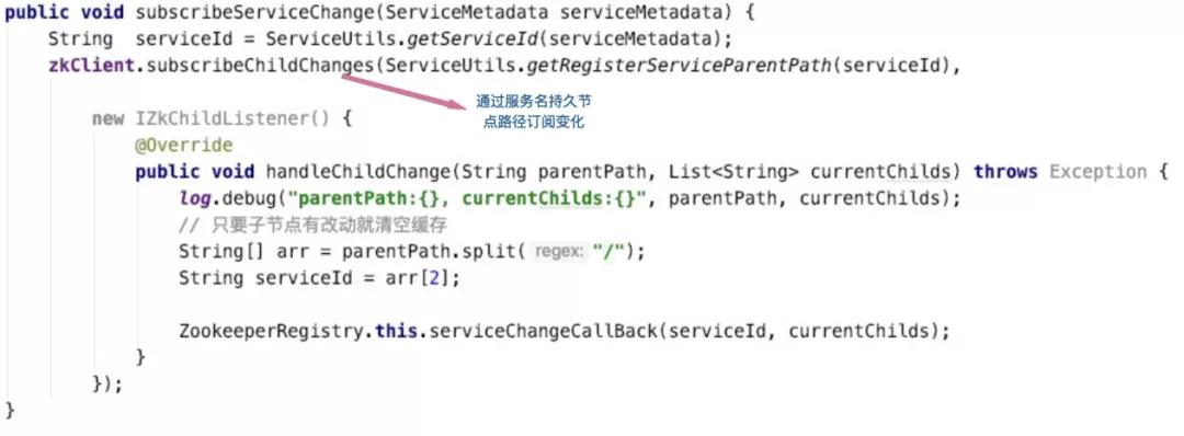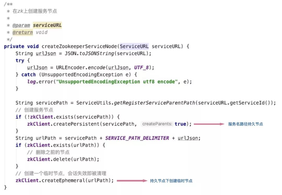 我们采用的是对每个服务名创建一个持久节点,服务注册时实际上就是在zookeeper中该持久节点下创建了一个临时节点,该临时节点存储了服务的IP、端口、序列化方式等。
