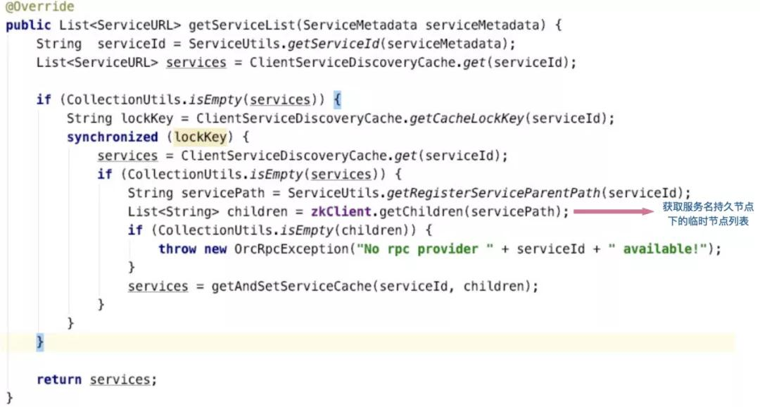 客户端获取服务时通过获取持久节点下的临时节点列表,解析服务地址数据: