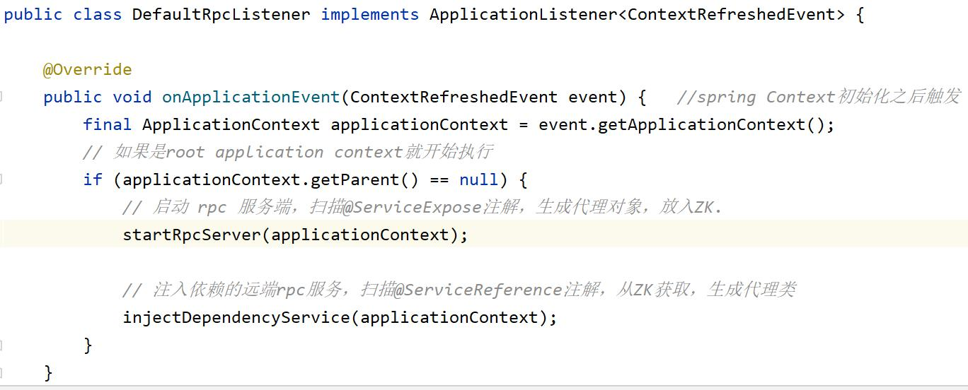 那么怎么知道Spring IOC刷新完成,这里就使用一个Spring提供的监听器,当Spring IOC刷新完成,就会触发监听器。