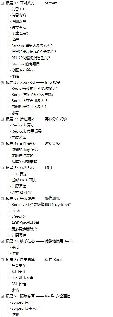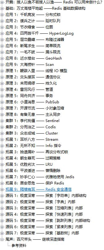 以上图为例,上面的例举的就是Redis的最常用的核心知识点,掌握了上面这些,面试跟日常开发肯定是够用了,不过你要是想真正的精通Redis这个技术栈,只会上面这些肯定是不够的!如果你自诩自己已经掌握了Redis基础的方方面面,那么不妨来看看LZ今天要为大家介绍的这份Redis高级笔记,这份笔记从原理,集群,应用,拓展,源码五个方面全方位剖析Redis,看完之后你就会知道,原来Redis还能这么玩!
