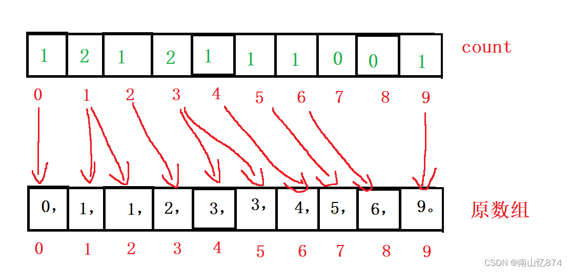 所以我们现在可以初步的来想一下,用于统计次数的count数组大小是否可以直接使用原数据中最大的一个数据??(之后回答)。
