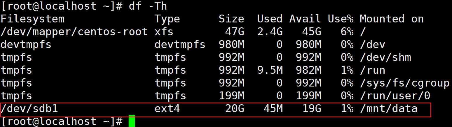 mount /dev/sdb1 /mnt/data #挂载 (临时挂载)df -Th #查看