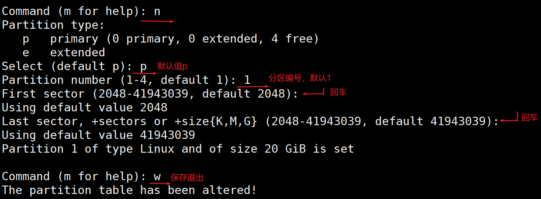 n → p → 1 → 回车 → 回车 # 新建主分区1,默认起止扇区