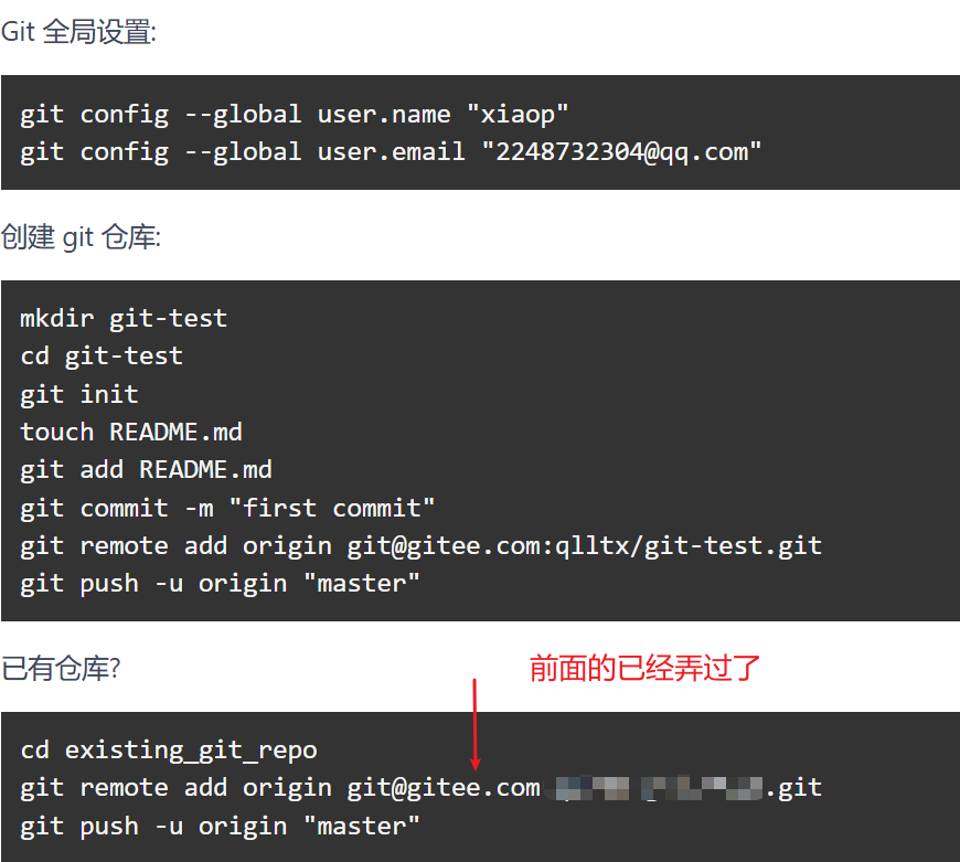 [root@localhost xaiop-app]# git push -u origin "master" [root@localhost xaiop-app]# git remote -v origin git@gitee.com:qlltx/git-test.git (fetch) origin git@gitee.com:qlltx/git-test.git (push)