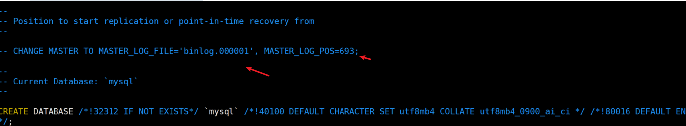 # 设置从库连接主库信息,定义从库连接主库同步位置点自动复制 mysql> help change master to -- 获取连接主库,以及定义同步位置点的数据库配置模板信息 [root@xiaoQ-01 ~]# vim /tmp/full.sql -- CHANGE MASTER TO MASTER_LOG_FILE='binlog.000003', MASTER_LOG_POS=681; -- 通过备份文件获取同步位置点信息 SHOW MASTER STATUS; #查看MASTER_LOG_FILE='mysql-bin.000004',MASTER_LOG_POS=1638, #注意MASTER_LOG_FILE='binlog.000001',文件名对不对 mysql> CHANGE MASTER TO MASTER_HOST='192.168.200.145', MASTER_USER='repl', MASTER_PASSWORD='123456', MASTER_PORT=3306, MASTER_LOG_FILE='binlog.000001', MASTER_LOG_POS=881, MASTER_CONNECT_RETRY=10; -- 以上配置主从同步信息在 --从库 进行执行;