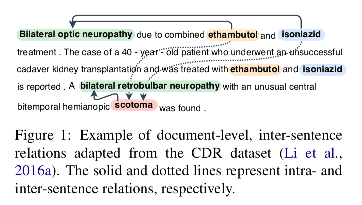 The multiple mentions of the target entities in different sentences can be useful for the identification of inter-sentential relations, as these relations may depend on the interactions of their mentions with other entities in the same document. The figure above is an good example of identifying the relationship between “ethambutol”, “isoniazid” and “scotoma”, where they all interact with the green colored entity (and its alias).