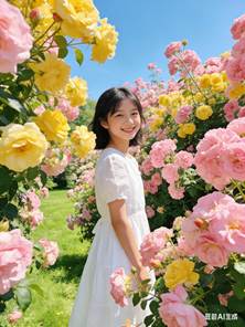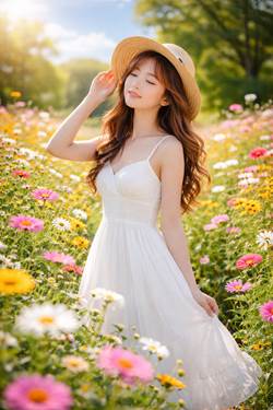 请生成一张名为“花丛中的女孩”的图像:明媚的阳光下,一个身穿白裙子的女孩站在花丛中 |