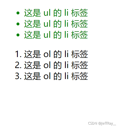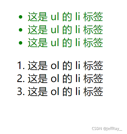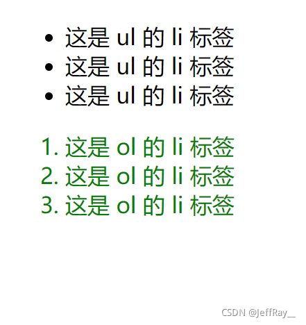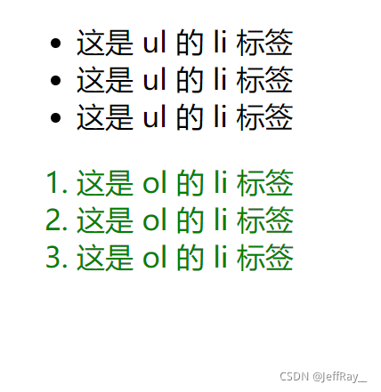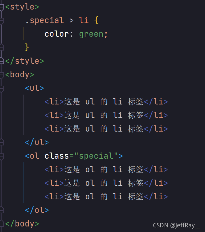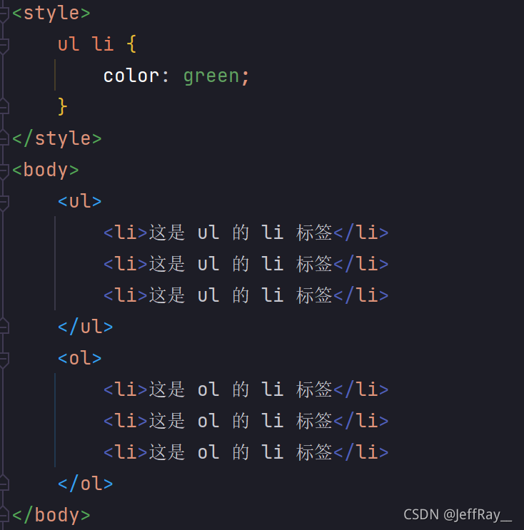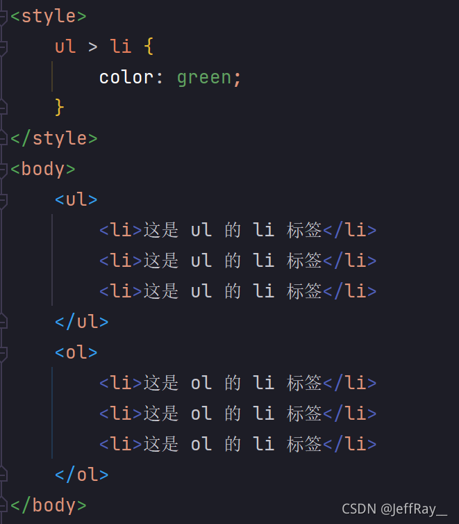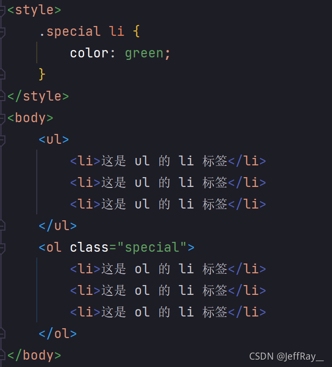 其方式是先指定父元素,再去指定子元素。这里的子元素不一定要是父子关系,也可以是爷孙关系,总之只要是子关系即可。接下来通过后代选择器来选定 <ul> 的 <li> 标签,而 <ol> 的 <li> 标签不选定