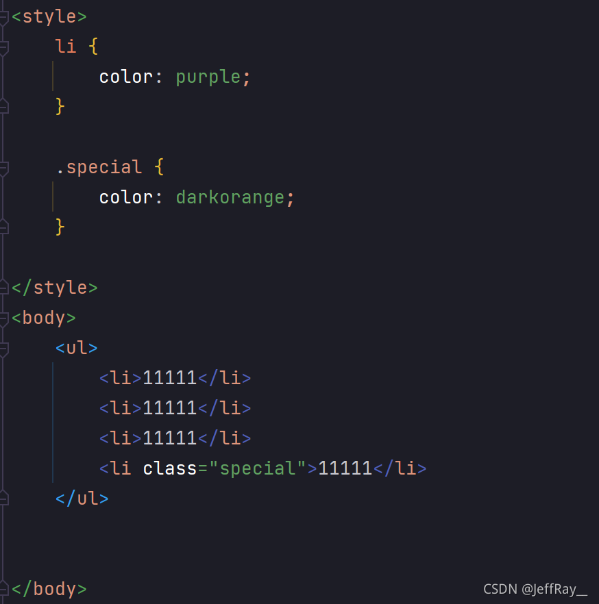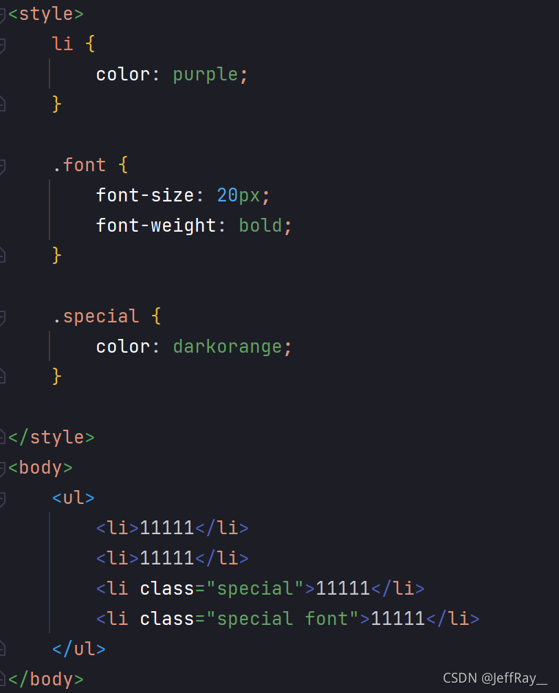 需要注意的是,一个类可以应用多个标签,一个标签也可以使用多个类。接下来我通过代码示例让多个 <li> 都是 "special" 类,让一个 <li> 可以使用多个类(多个类之间用空格分离):