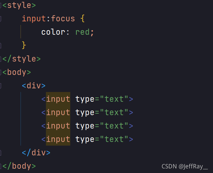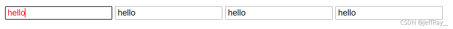 表示获取焦点的时候被选中。凡是带有图像化界面,都涉及焦点的概念,我们使用电脑时,程序窗口常常带有一个输入框,针对输入框,我们就需要知道那个输入框获取到了焦点,即我们键盘的输入是针对此输入框。示例:有四个输入框,我们在获得焦点的输入框输入时,文本颜色变为红色。