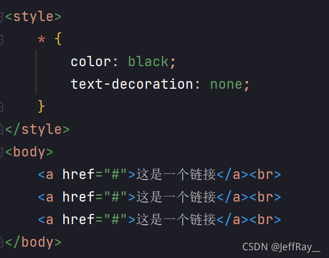 通配符选择器是以 * 开头的选择器,会选取所有的标签。这个一般用于样式的擦除。我们知道 超链接标签是带有下划线并且字体颜色是蓝色的,通过通配符选择器我们就能擦除原有的样式。