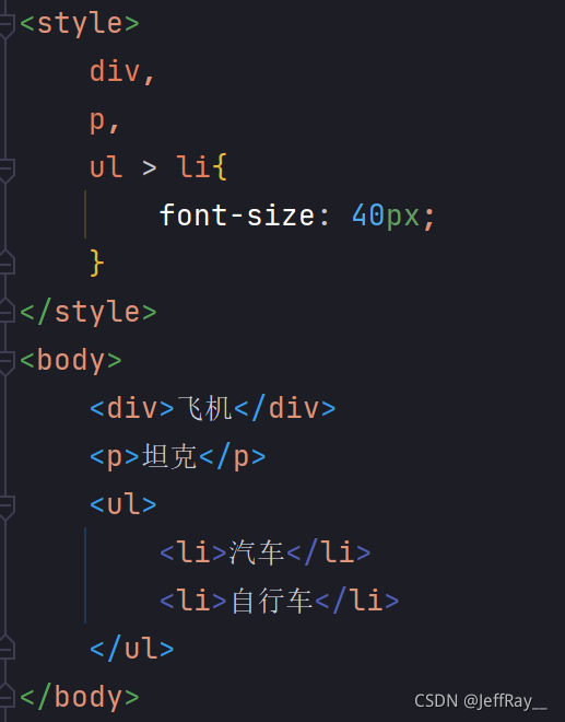 和后代选择器非常类似,不过子选择器只能选择子标签,至于孙子、曾孙子之类,不可以选中,父子标签通过 > 相连。接下来通过子选择器来完成上面的示例: