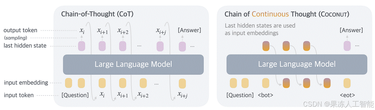 而COCONUT模型(右图)只有在确信之后才生成用户看到的实际单词。