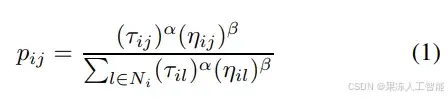 其中 Pij 是从 i 到 j 的路径选择概率,τij 是边 (i, j) 上信息素的强度,η 是距离的缩放系数(1/距离),N 是节点数。我们可以通过 α 来定义信息素的影响,通过 β 来控制距离的影响。