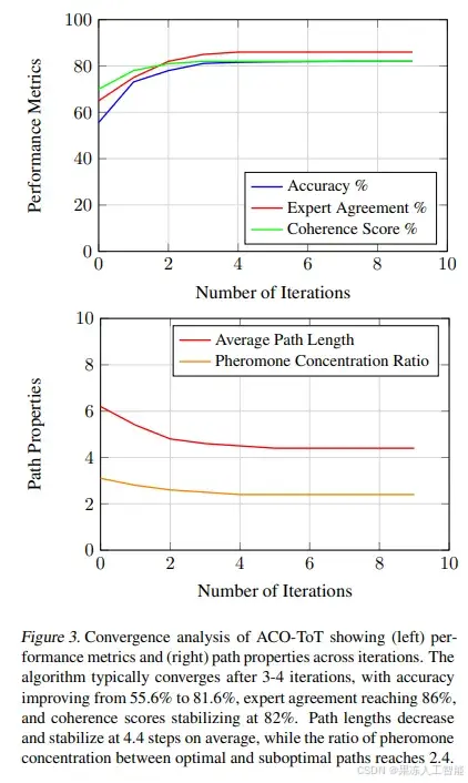 这种快速收敛在特征性的性能曲线上表现出来:在前 3–4 次迭代中性能迅速提高,随后进入渐近稳定状态,这表明该方法能够高效地探索推理空间。——来源