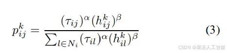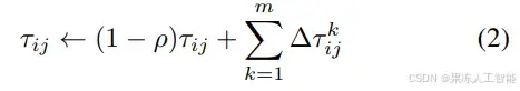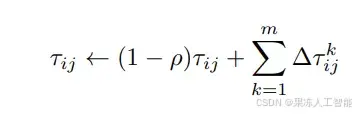 其中 ρ 是蒸发率,m 是蚂蚁的数量,Δτijk 是蚂蚁 k 添加的信息素数量。