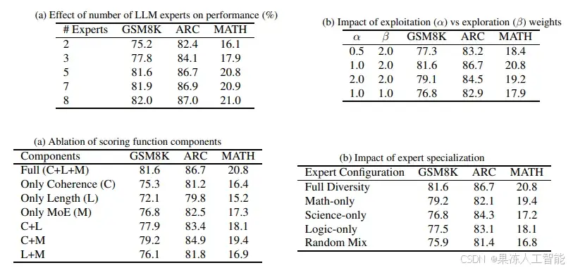 其中 C(P) 是语义一致性(通过嵌入计算两个思维的余弦相似度),L(P) 用于惩罚过长的路径(基于路径长度的负对数),M(P) 是专家模型评分(多个 LLM 的评分),w1, w2, w3 是平衡这些项的权重。