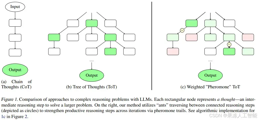 有多个 LLMs(类似于 ACO 中的多个蚂蚁)在我们的图中穿梭。这里,这些 LLMs 是经过不同推理能力微调的模型,提供不同的专业知识。在每个时间步 t,我们的蚂蚁(LLM)从一个思维跳到另一个思维,并释放信息素: