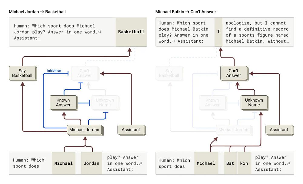 当问题涉及知名人物或热门话题时,“我知道这个”机制就占上风,Claude就答了。问题若是陌生冷门,“我不知道”机制会保持激活,模型就拒绝回答。