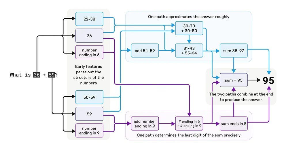 Anthropic发现Claude其实是用多种策略并行处理加法的。在算36 + 59时,模型网络的一部分关注总量(大致结果),另一部分专注于最后一位数字。