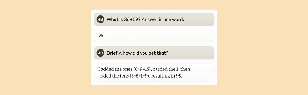更有意思的是,Claude似乎并不知道自己在这样做。问它:“你怎么得出95的?” Claude会像个学生一样回答:“我把个位相加了。”