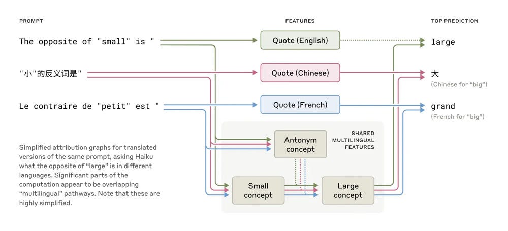 举个例子:当被要求在多种语言中回答“small的反义词”时,模型并不是为每个翻译走完全不同的路径。而是先理解“smallness”的概念、“opposite”的概念,再到“largeness”的概念,最后才翻译成英语的 large,中文的 大,或法语的 grand。