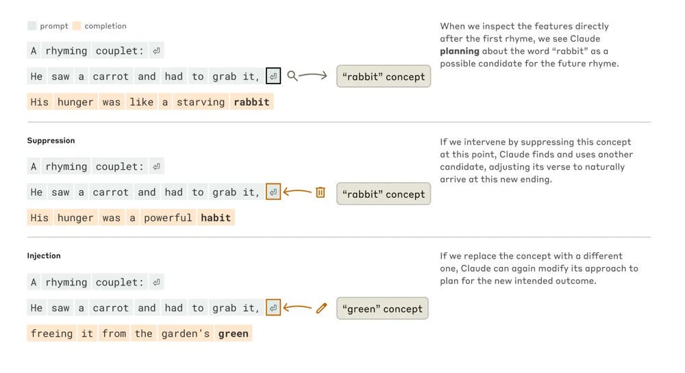 这说明Claude不是在背诵诗,也不是靠概率随便猜词。它是在主动规划,并能实时调整。