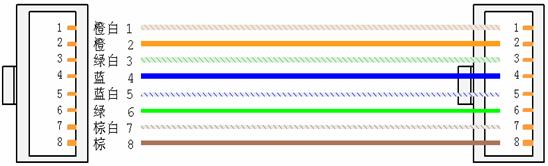 EIA/TIA-568-B简称T568B。其双绞线的排列顺序为:橙白,橙,绿白,兰,兰白,绿,棕白,棕。依次插入RJ45头的1~8号线槽中。参见下表。